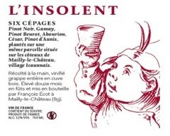 Most of his sources are either purchased or rented (including some plots in Fleurie) and so he bottles under the L’Insolent Négoce moniker. The vineyard that he does own is near his house and was abandoned for eighty years before he resurrected it. Many of the heritage grapes planted there are sourced from other natural winemaking colleagues, including Dominique Derain, Marc Pesnot, and Christian Chaussard.